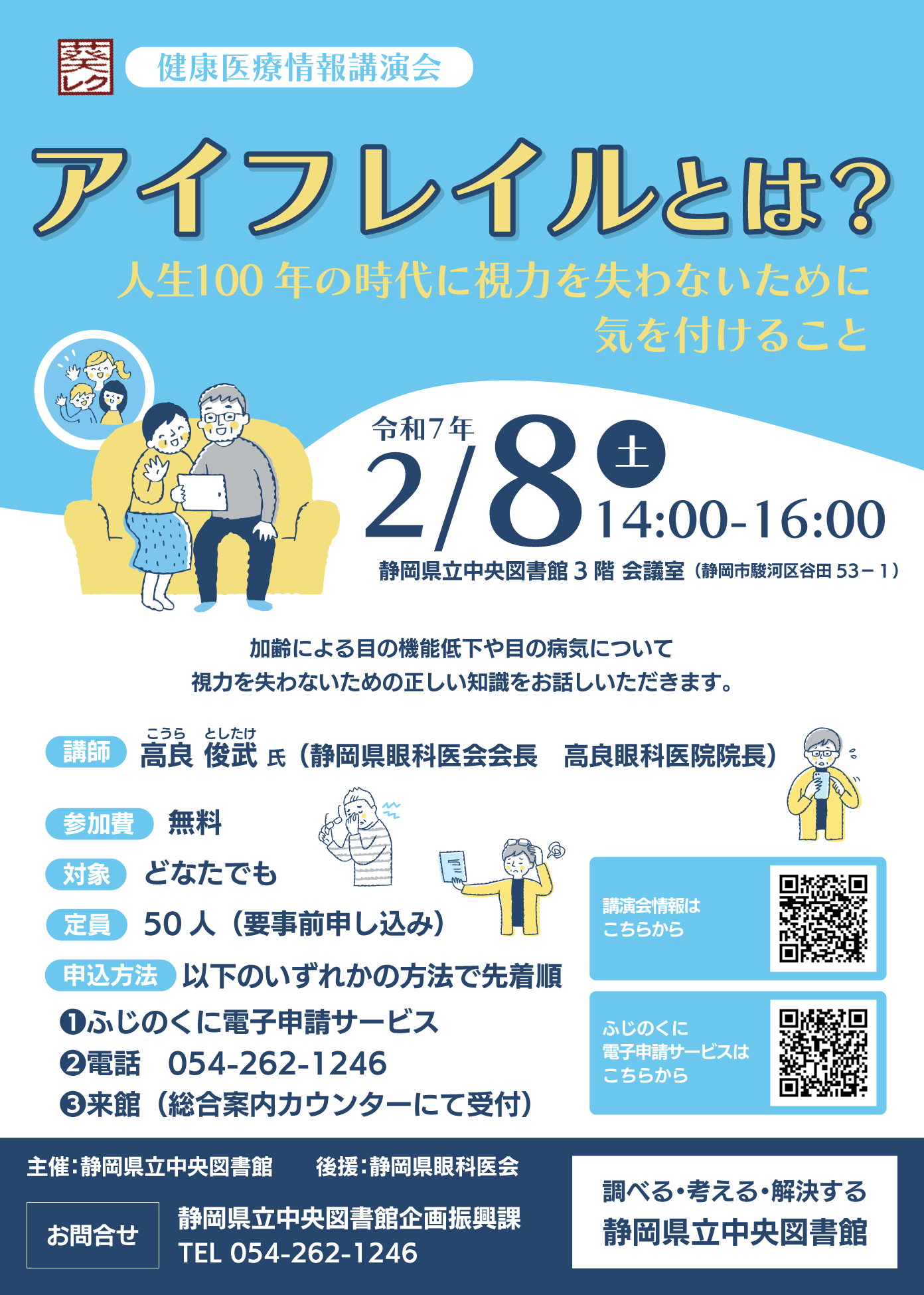 令和7年2月8日(土)14:00~16:00、静岡県立中央図書館3階会議室にて、「アイフレイルとは?人生100年の時代に視力を失わないために気を付けること」と題した講演会が開催されます。