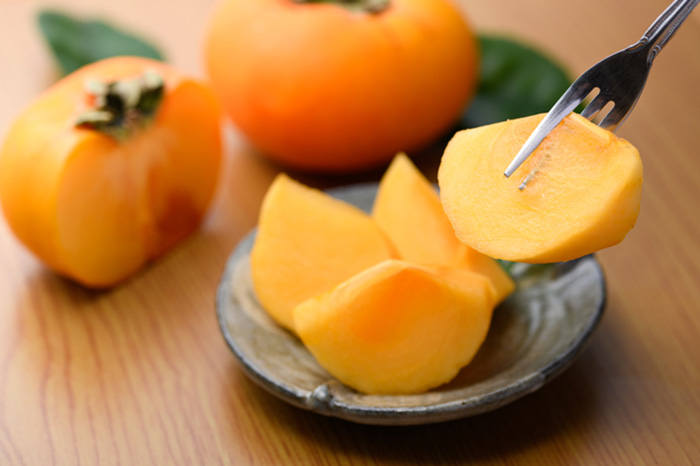 静岡で収穫できる柿は甘い「次郎柿」と渋柿の「四つ溝柿」。「次郎柿」は森町に原木があり、静岡県の天然記念物に指定されています。森町の柿は、皇室に献上されるほどの高品質で知られています。「四つ溝柿」の産地は県東部地域で、渋抜きをすると糖度が高く、食べ応えのある肉質で、甘さが際立ちます。1個で1日のビタミンCを摂取できるほど栄養価が高い柿。冬の免疫力アップや風邪予防、美肌効果に役立ちます。