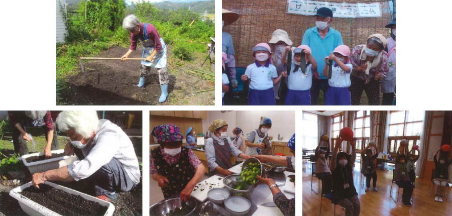 コロナ禍における介護予防活動として、町保健師、生活支援コーディネーター等が元気塾と連携し、フレイル予防に力を入れている。令和3年から畑で野菜作り「げんきファーム」を開始。畑を通して仲間が集まり役割が生まれている。今年はこども園の園児と一緒に苗植えや収穫を行ったり、町のボランティア養成講座の受講者等も「げんきファーム」をサポートしながら地域との交流を通じて参加者の意欲向上につながっている。