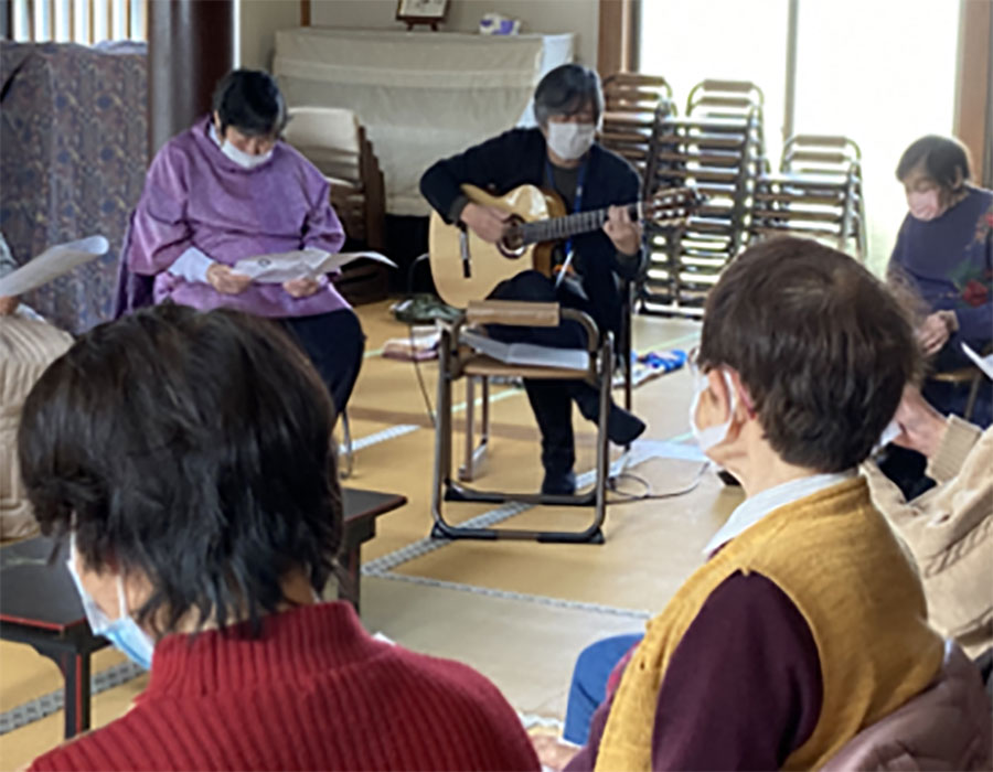 ギターの生演奏に合わせて季節の歌を歌ったり、盆踊りを踊ったり、楽しく頭と体を動かしましょう。そして、合間にはみんなでお茶を飲みながら、和気あいあいとおしゃべりを楽しみます。